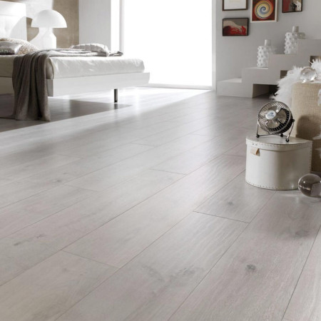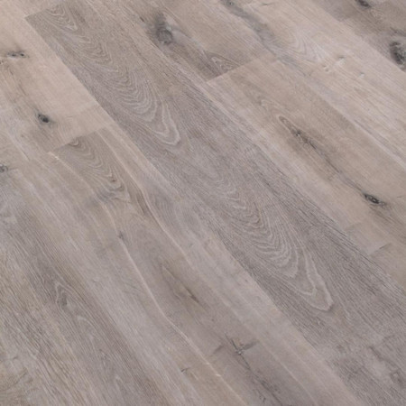 Trendy ash grey coloured laminate floor with natural colour / grain variation with a selection of knots